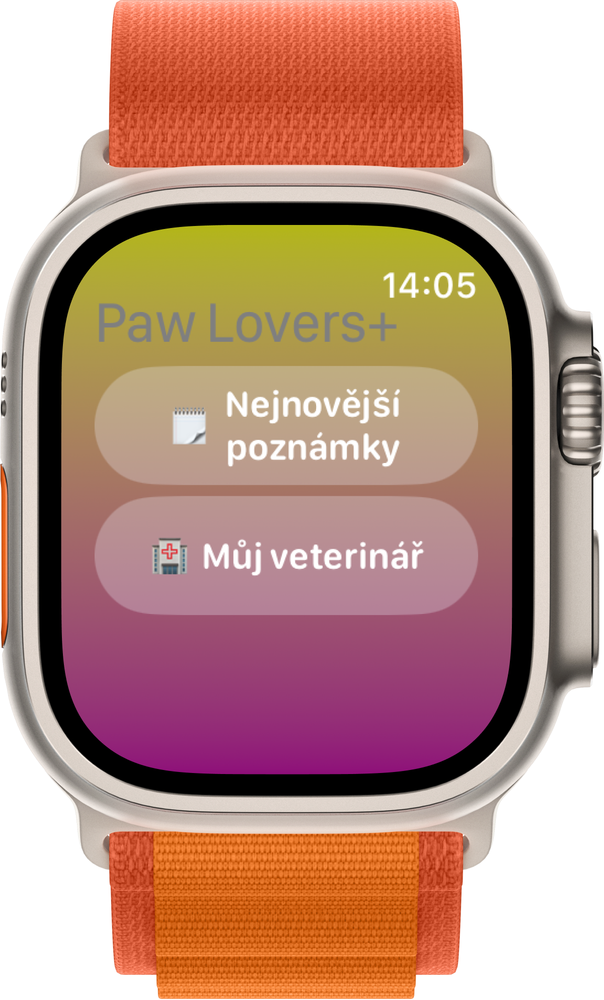 Použij Apple Watch ke kontrole poznámek s fotkami, mapami a počasím. Můžeš také volat a navigovat se ke svému veterináři.